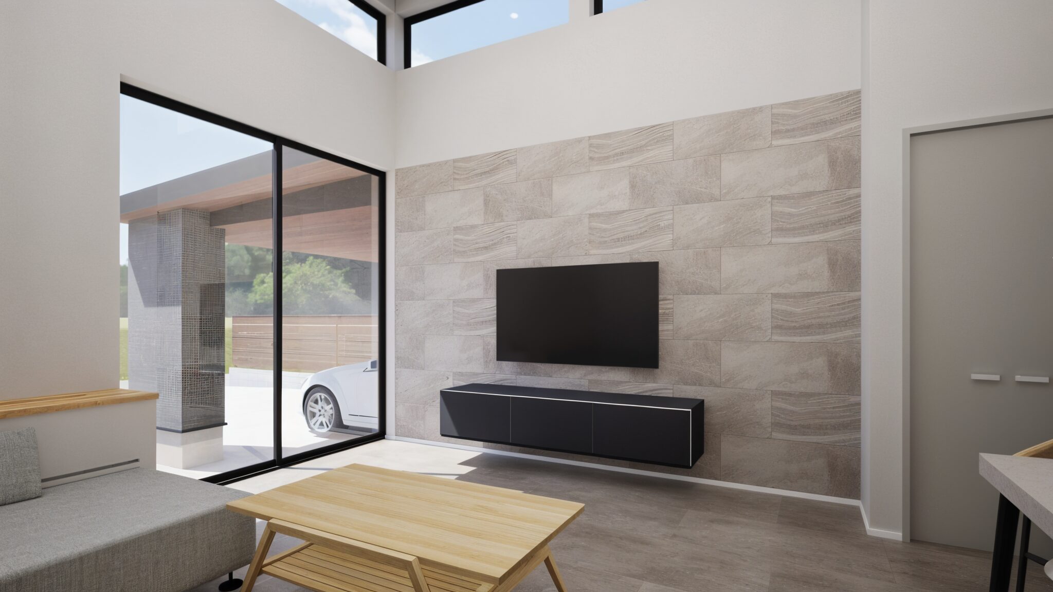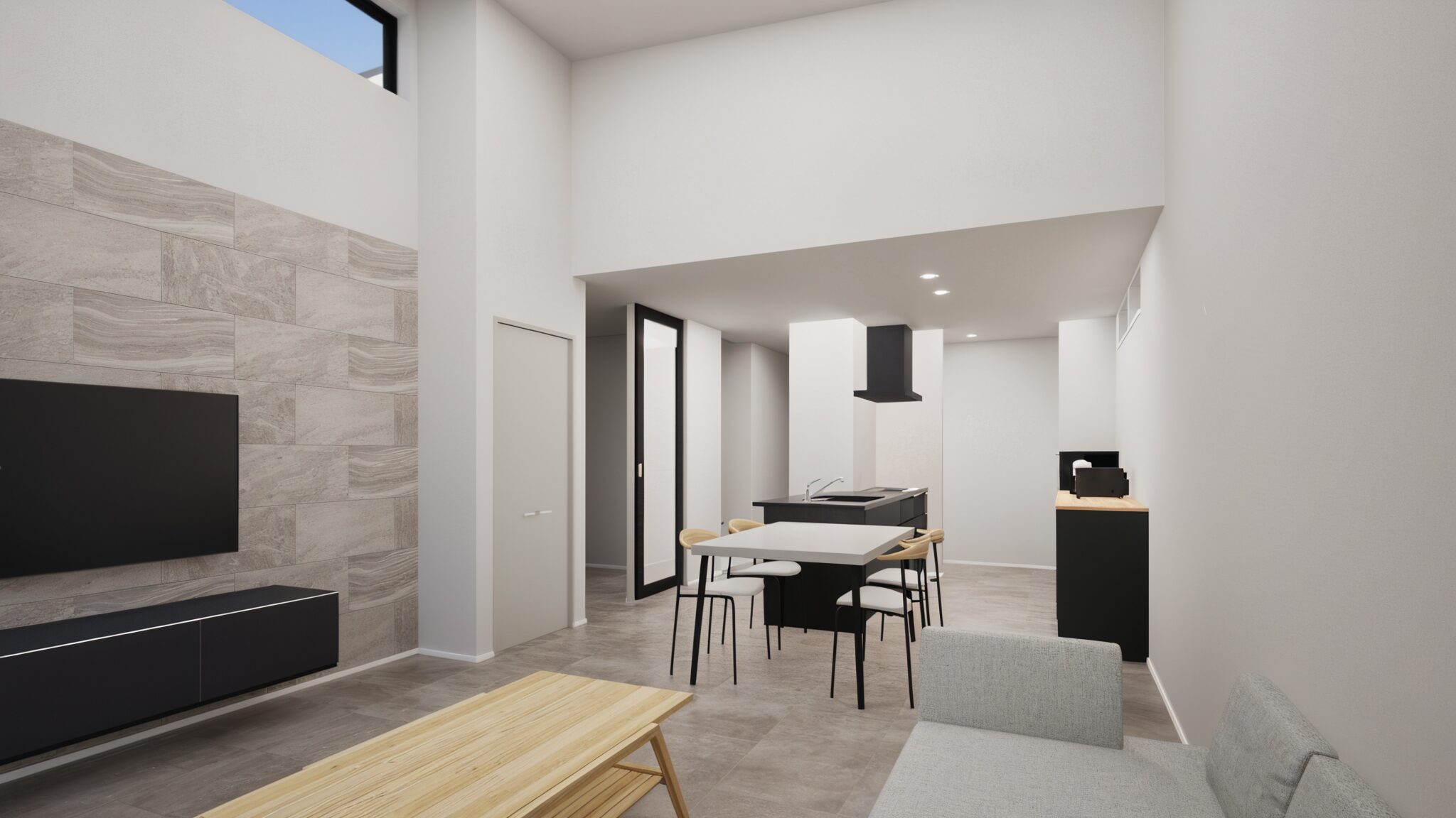 玄関から水回り、そしてリビングへとアクセスできる2WAY動線を採用しました。カーポート配置によるリビングの面積制約を、部分的な高天井でカバー。縦の広がりを生み出し、限られた空間以上の開放感を演出しています。