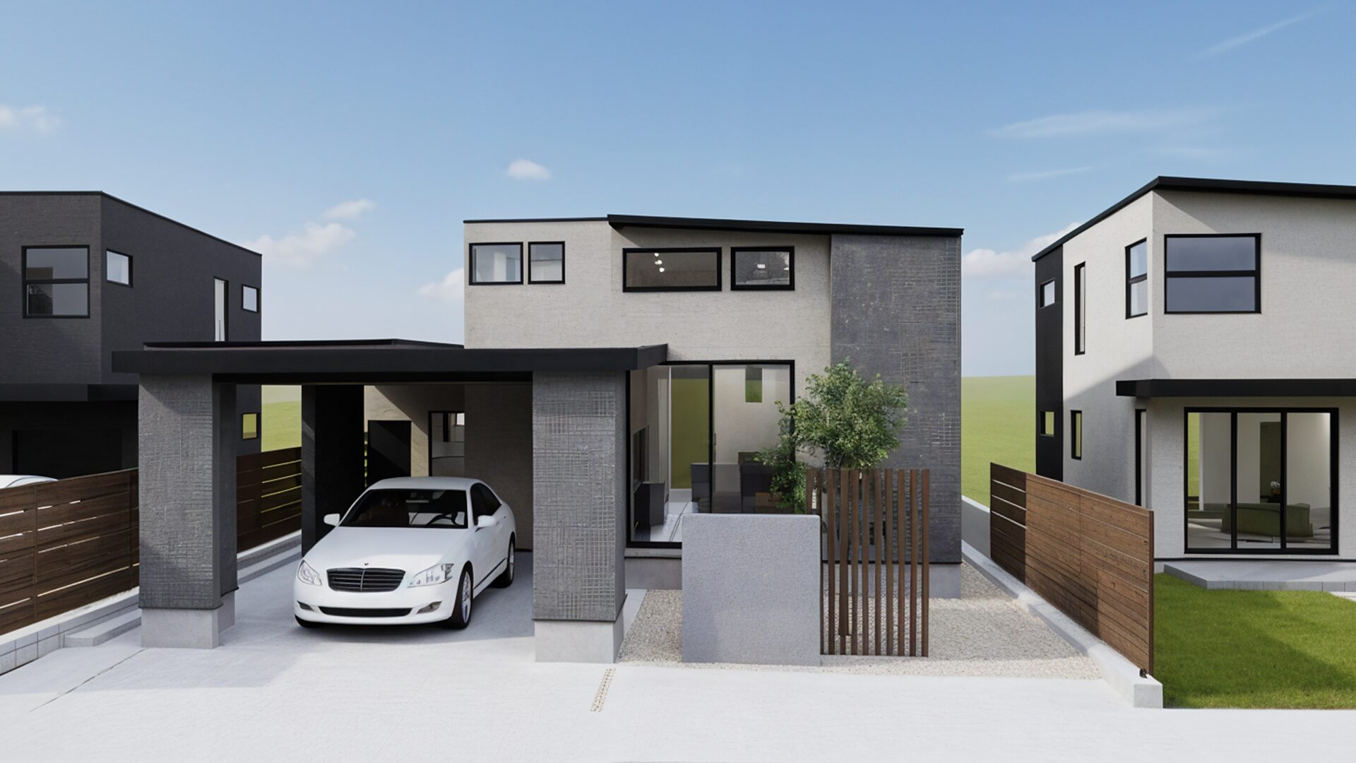 細長い敷地という条件の中で、『カーポートを正面に』というお客様のご要望を実現しました。限られたスペースでも圧迫感を与えないよう、1台分のカーポートと建物の視覚的なバランスを重視し、洗練された外観をデザインしています。