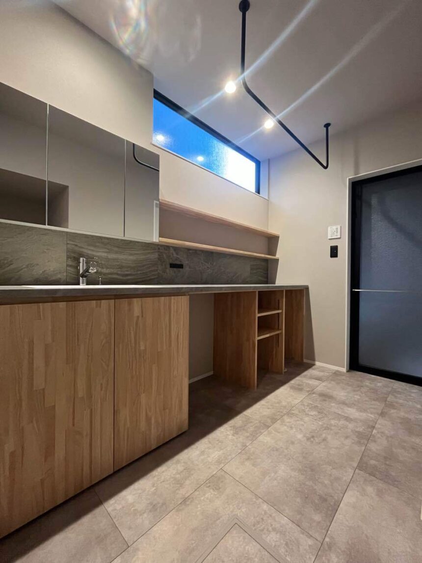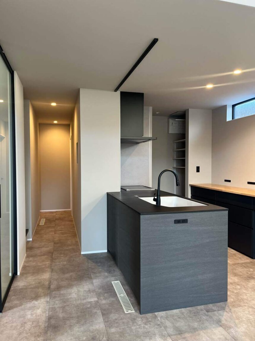 ダークトーンのモダンな外観にホテルライク内装インテリアが贅沢感を感じさせるお家です