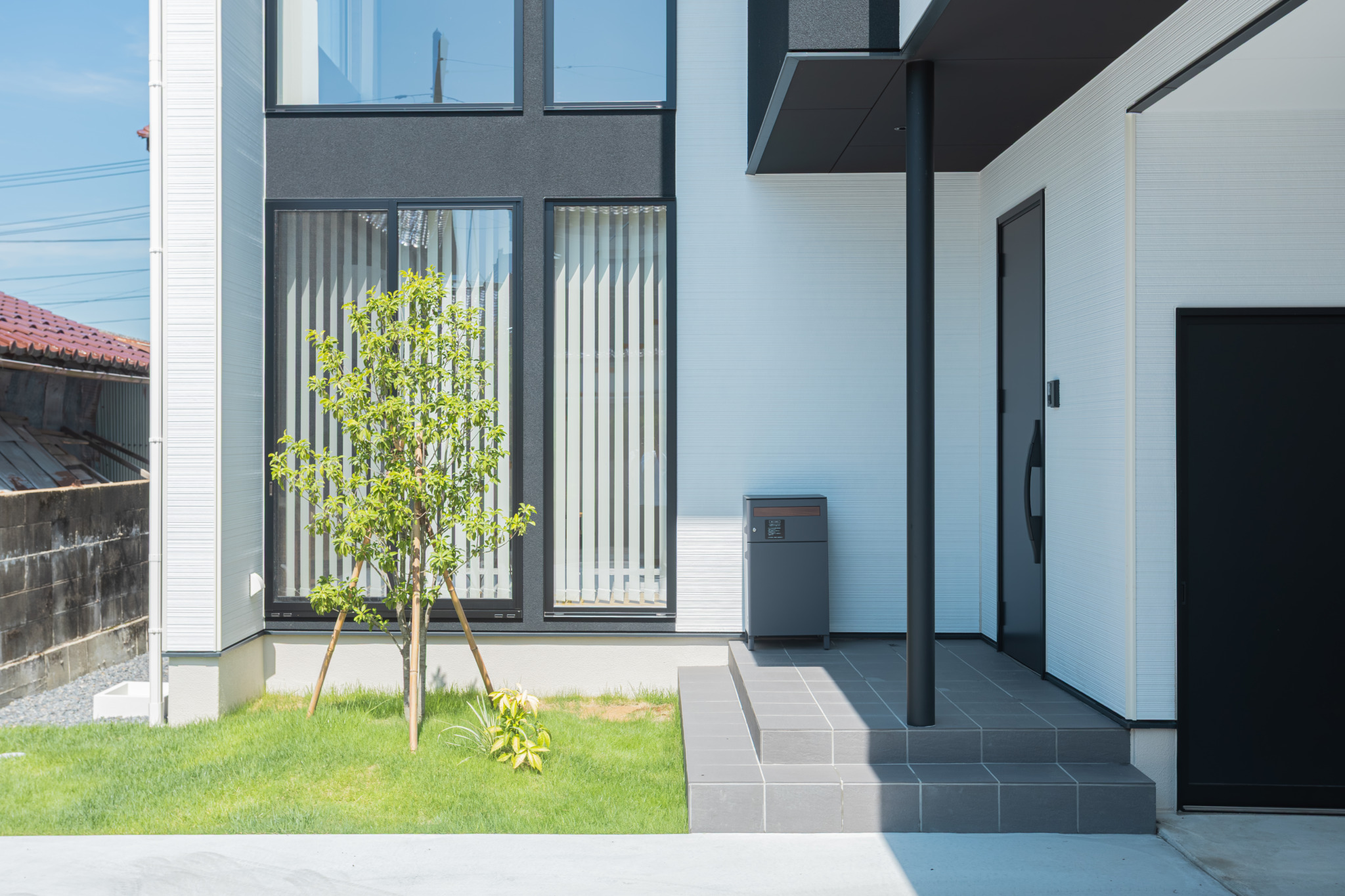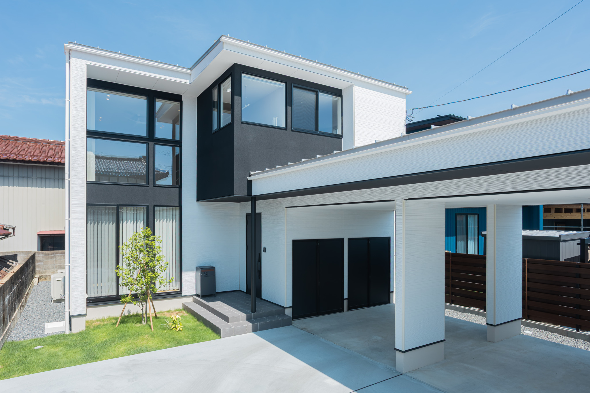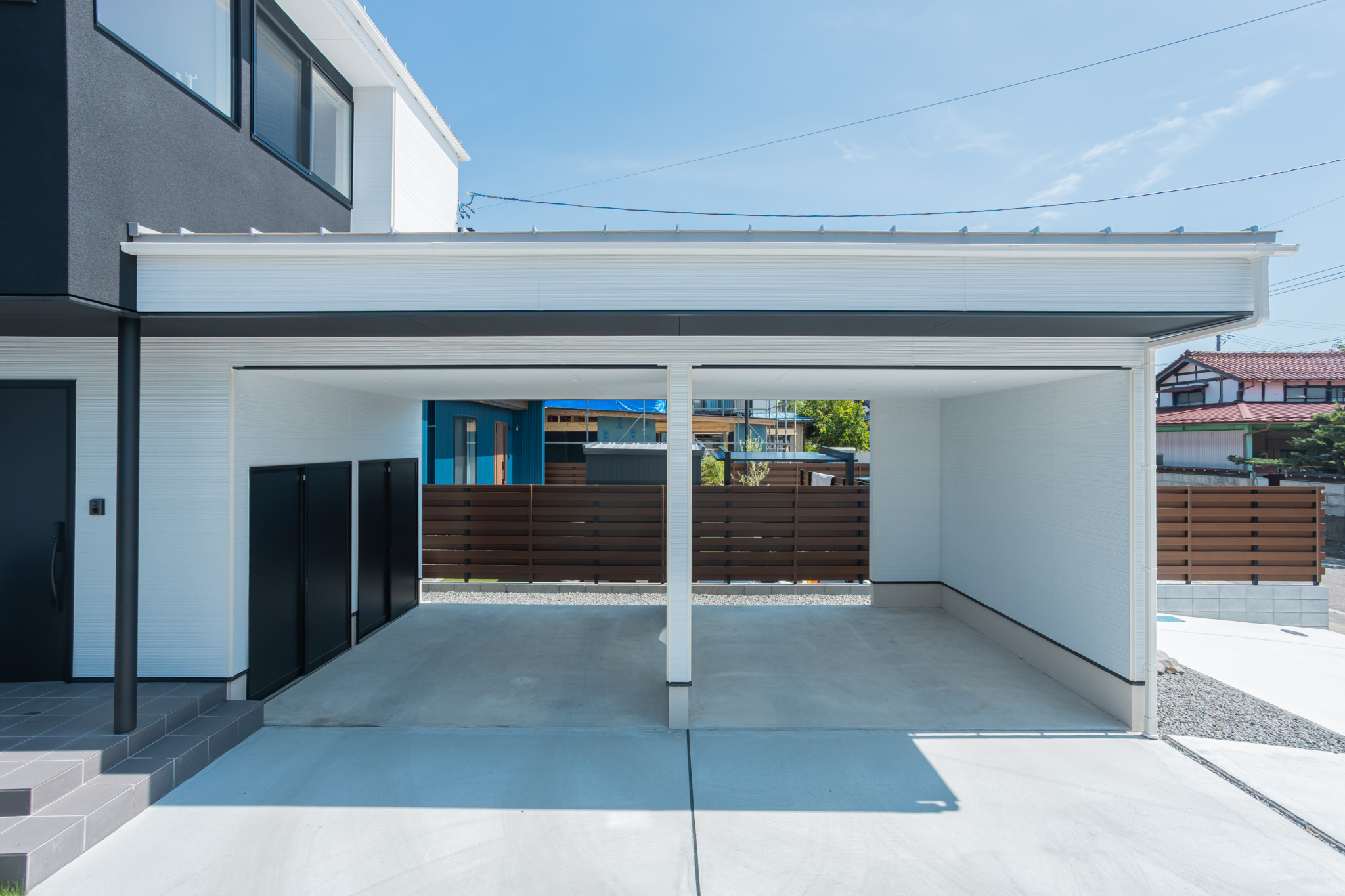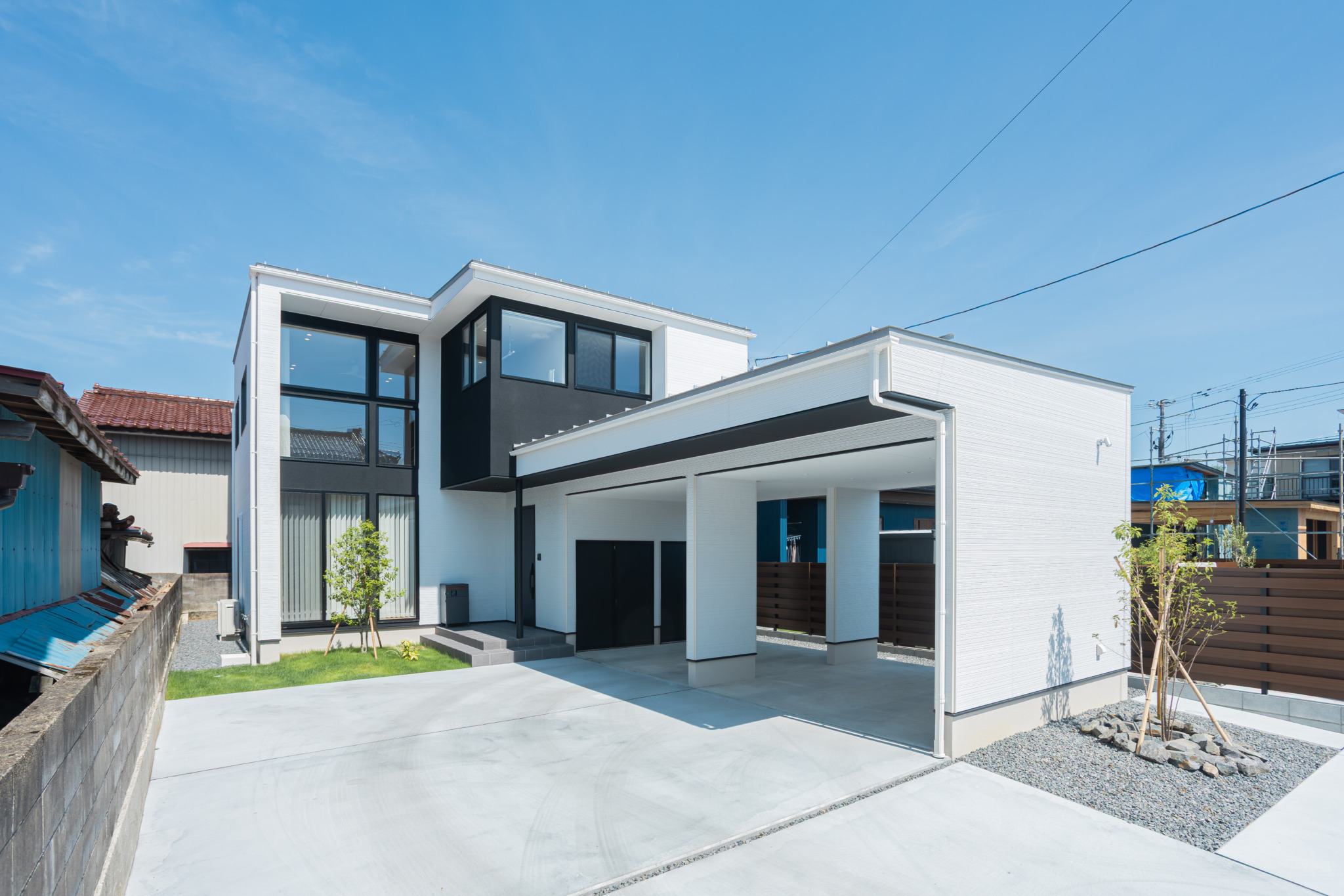 サッシバランスとフラットデザインの外壁で造られたモダンスタイルの外観でL型カーポートには外部ストックが2個ついているので、収納も◎