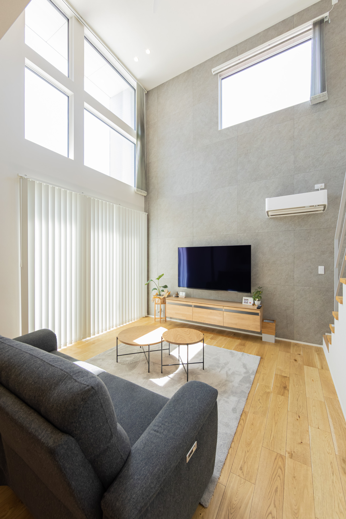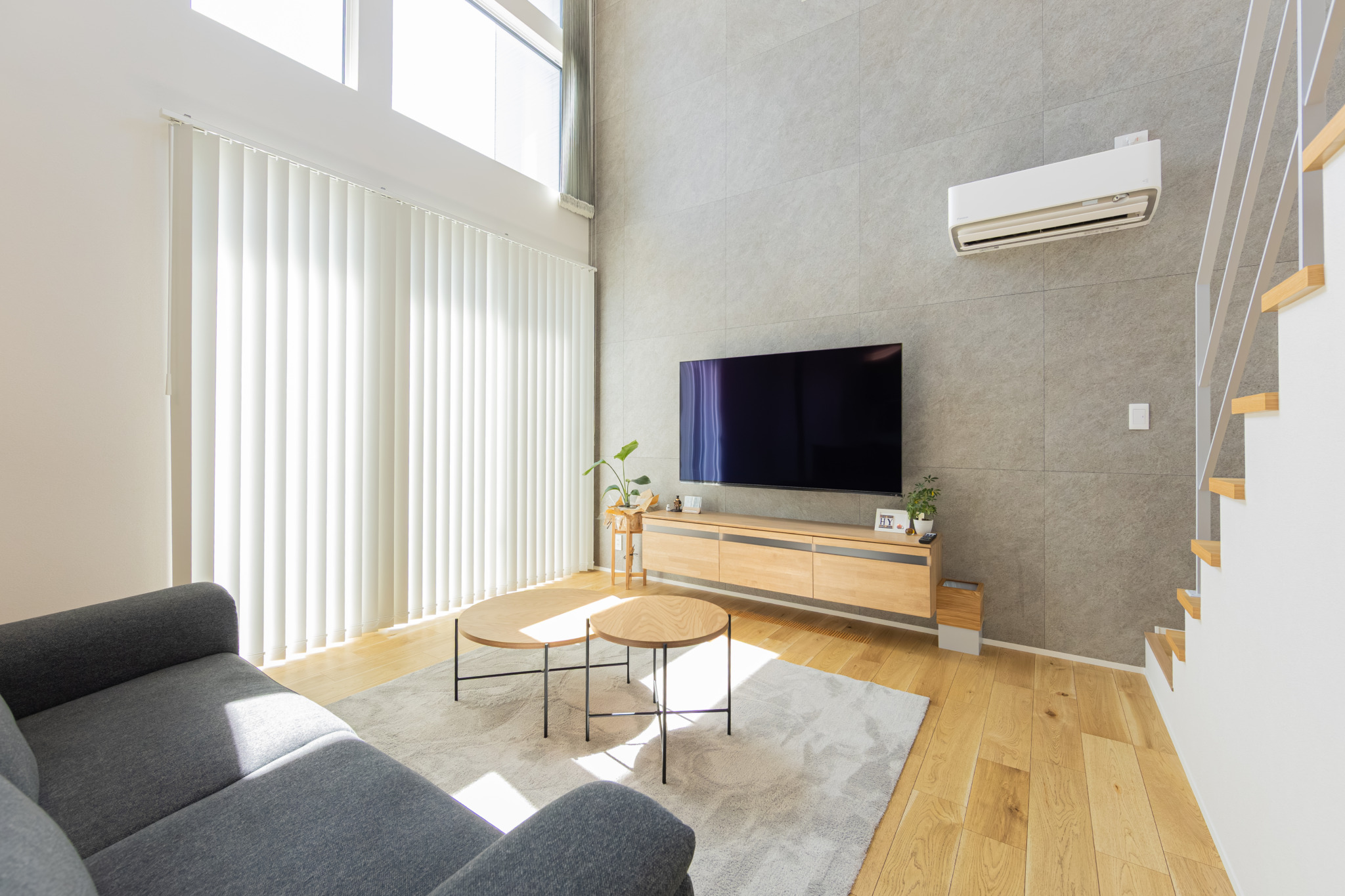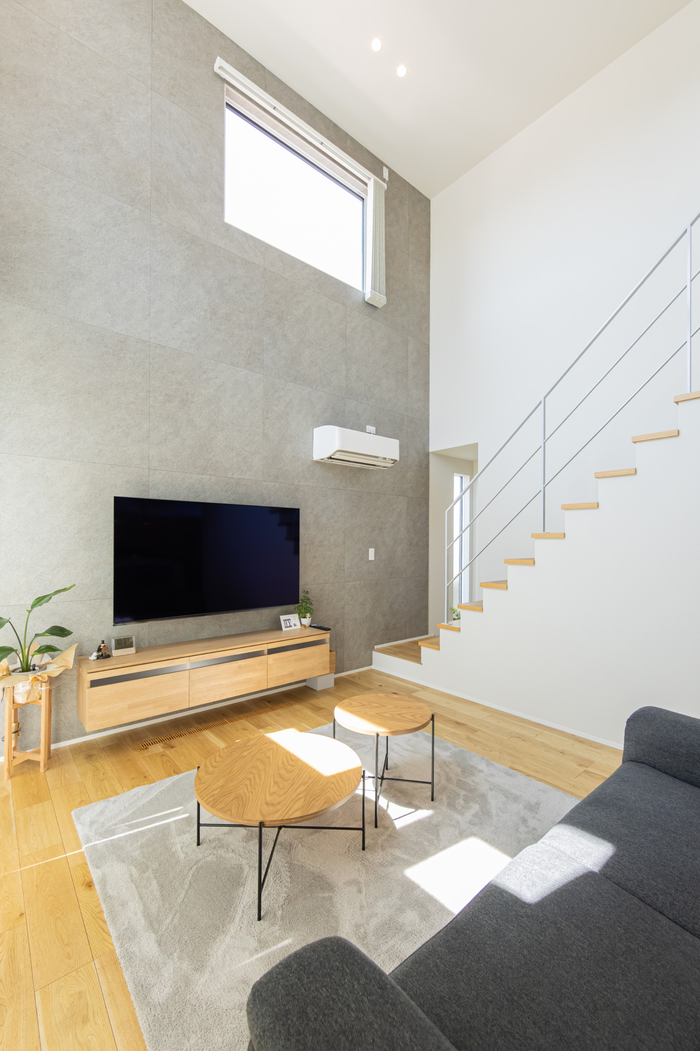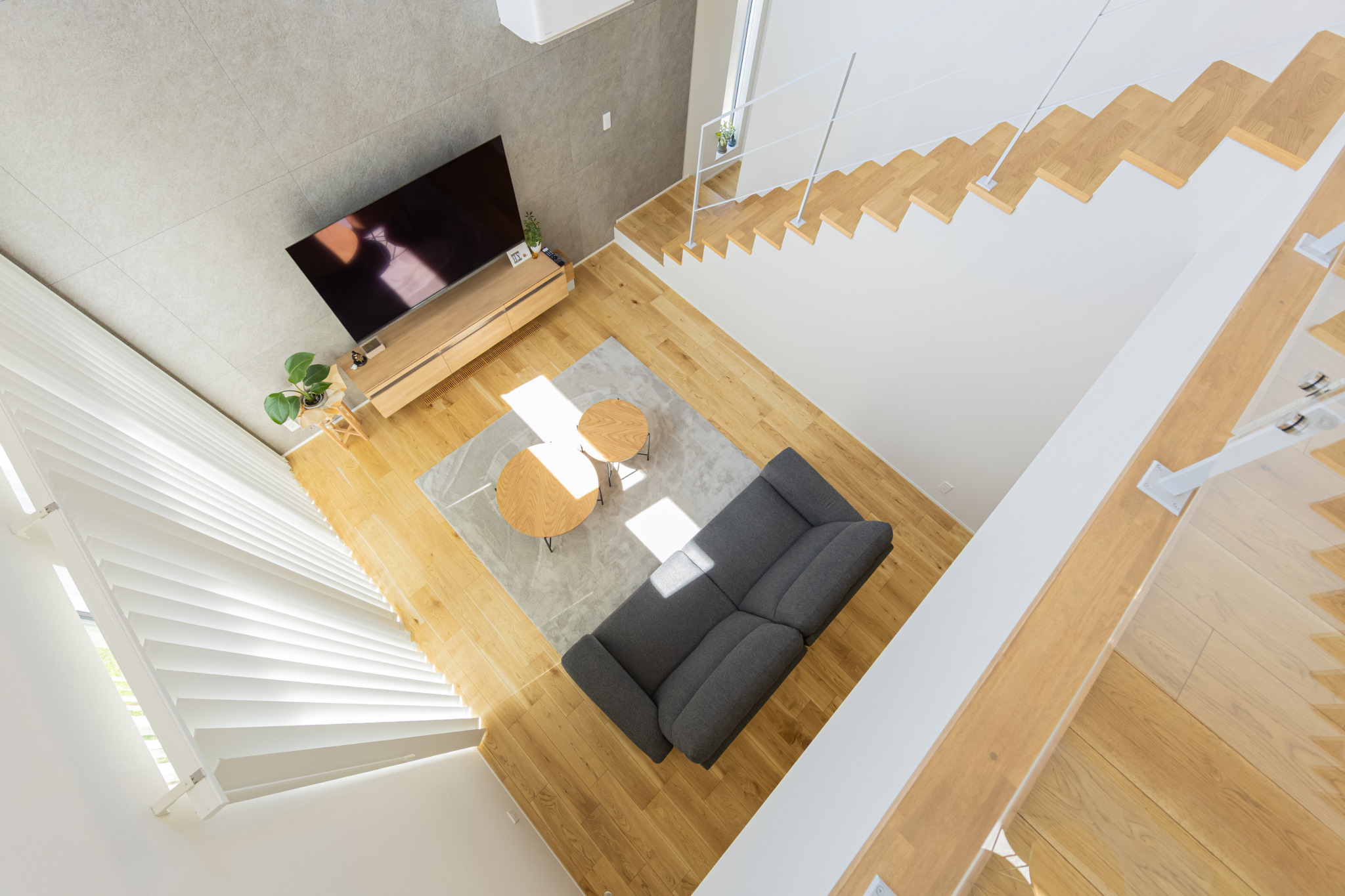 天井の高い吹き抜けは空間の広がりを与えてくれるだけでなく、自然光がたっぷりと入るので日中でも明るく快適にお過ごしいただけます。オープン階段のあるリビングは開放的で、モダンかつ洗練された印象に。