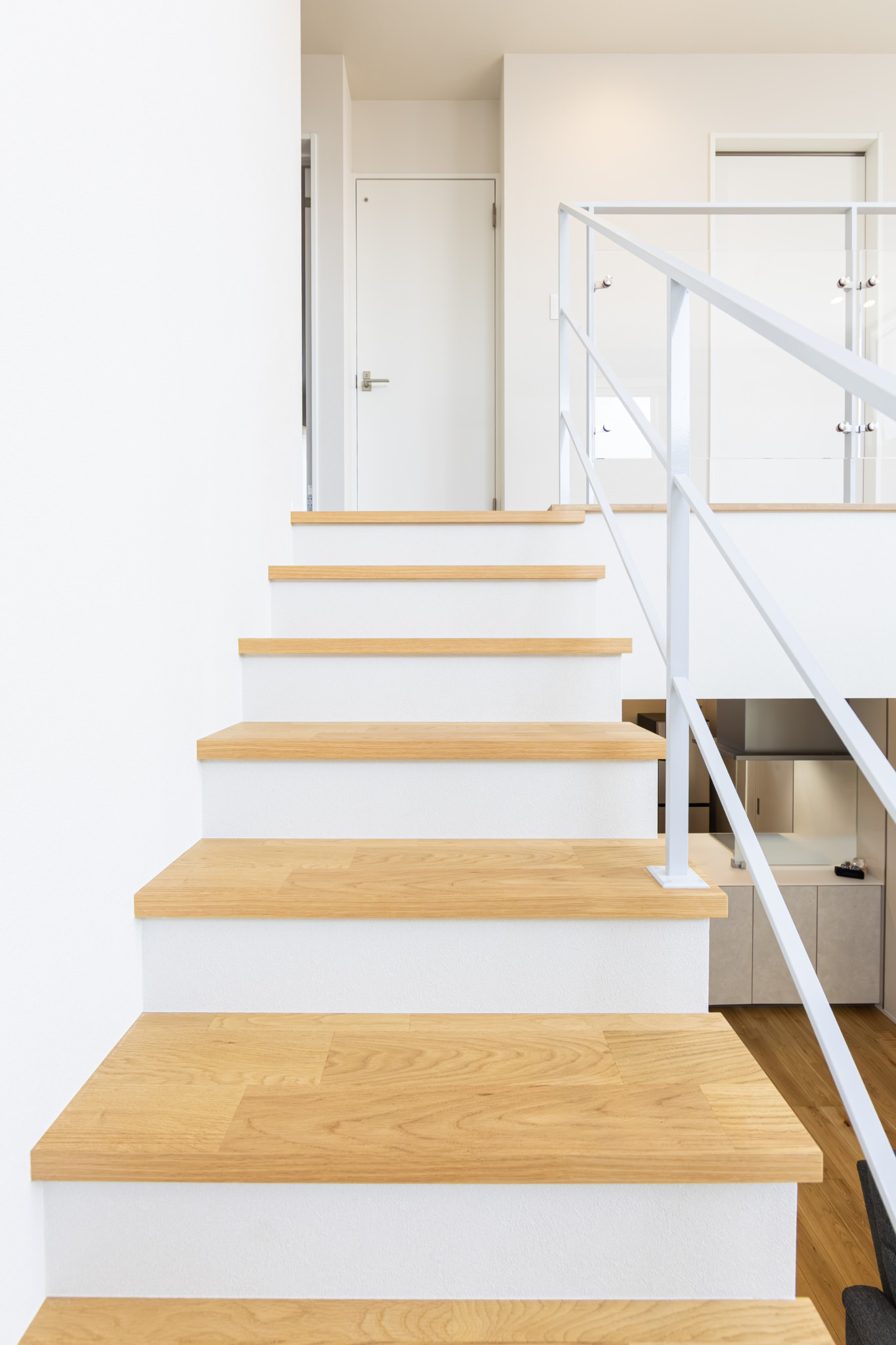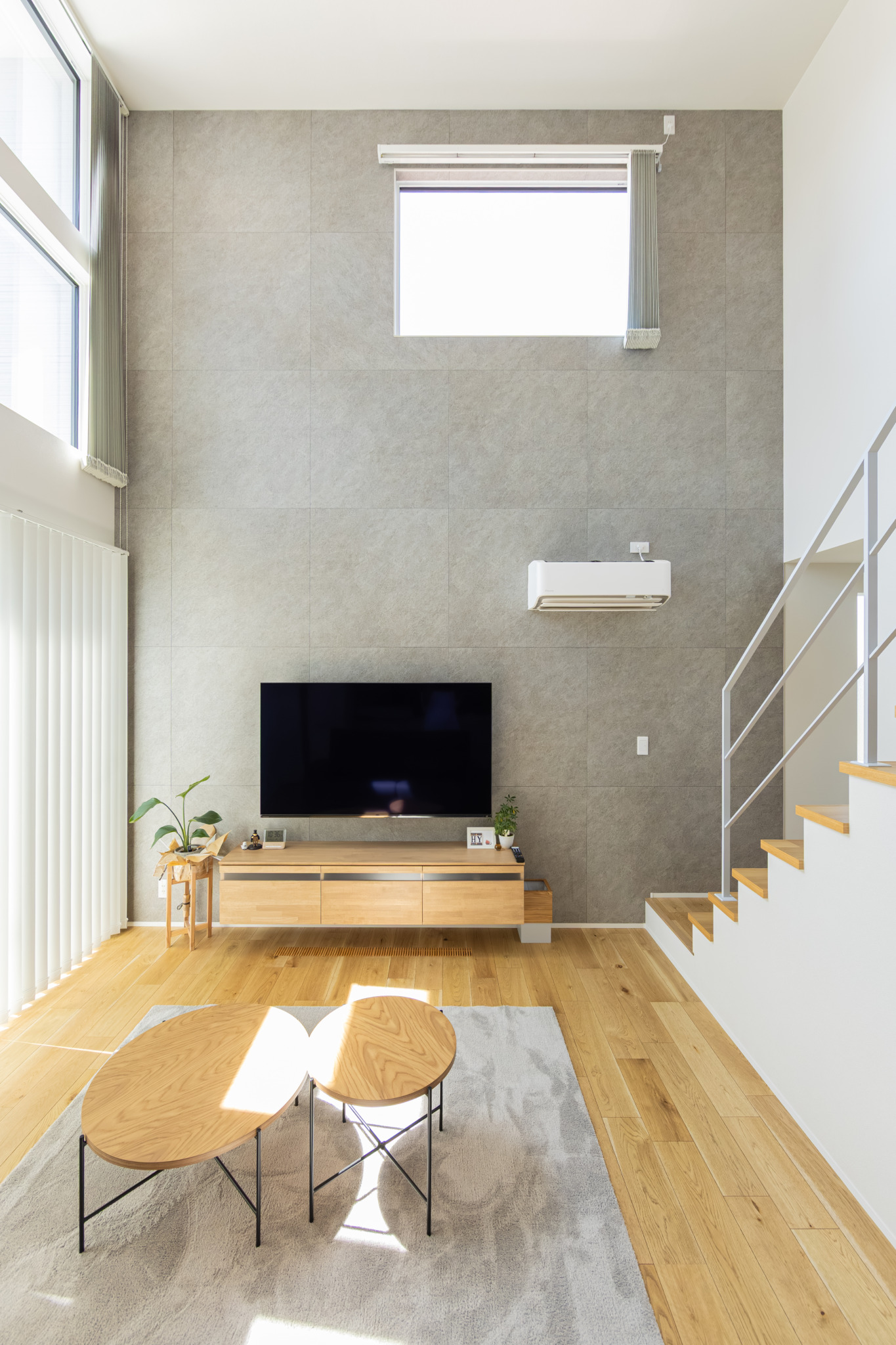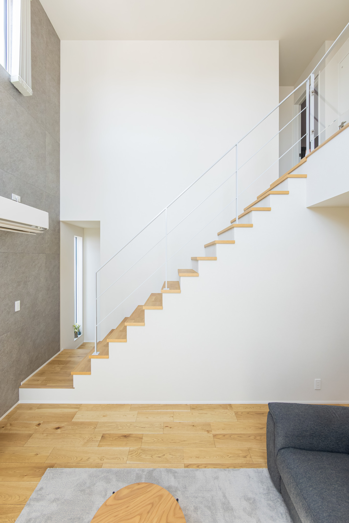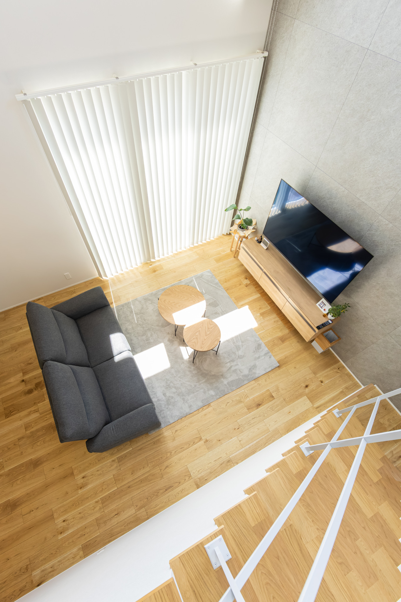 天井の高い吹き抜けは空間の広がりを与えてくれるだけでなく、自然光がたっぷりと入るので日中でも明るく快適にお過ごしいただけます。オープン階段のあるリビングは開放的で、モダンかつ洗練された印象に。