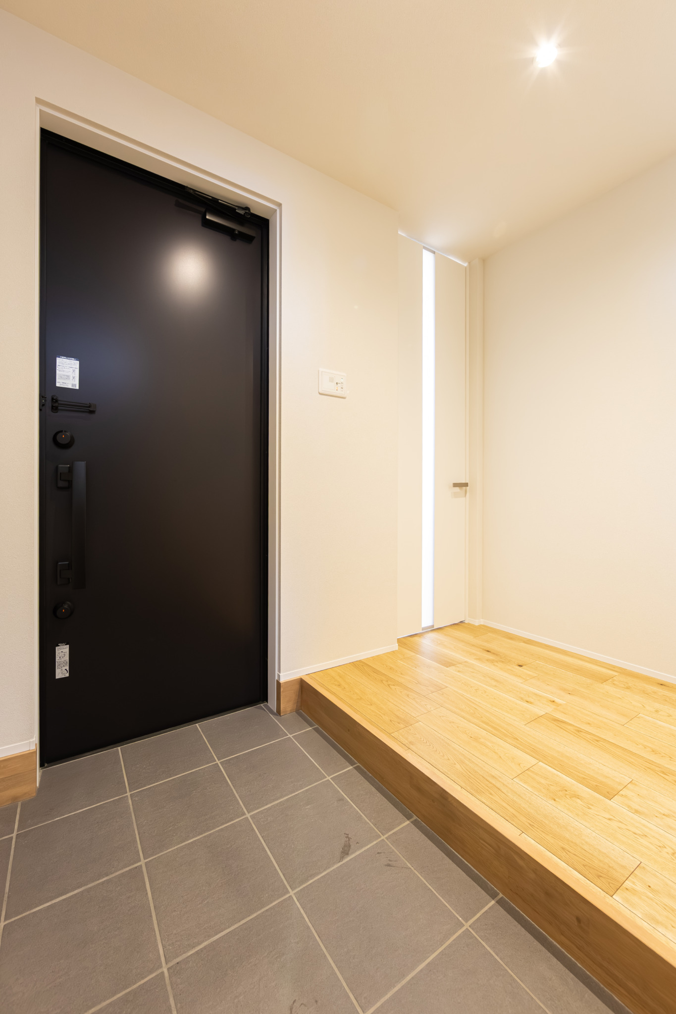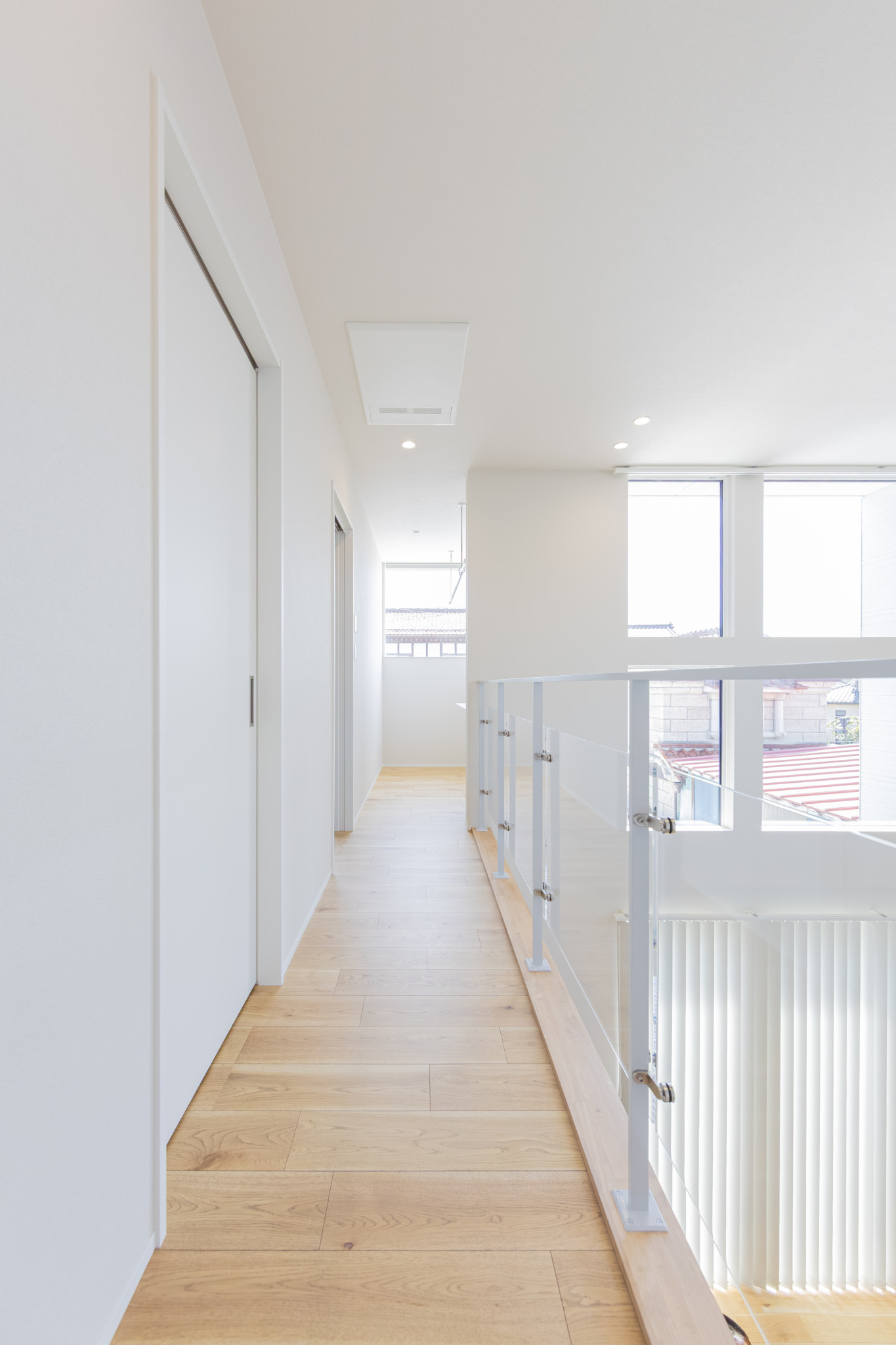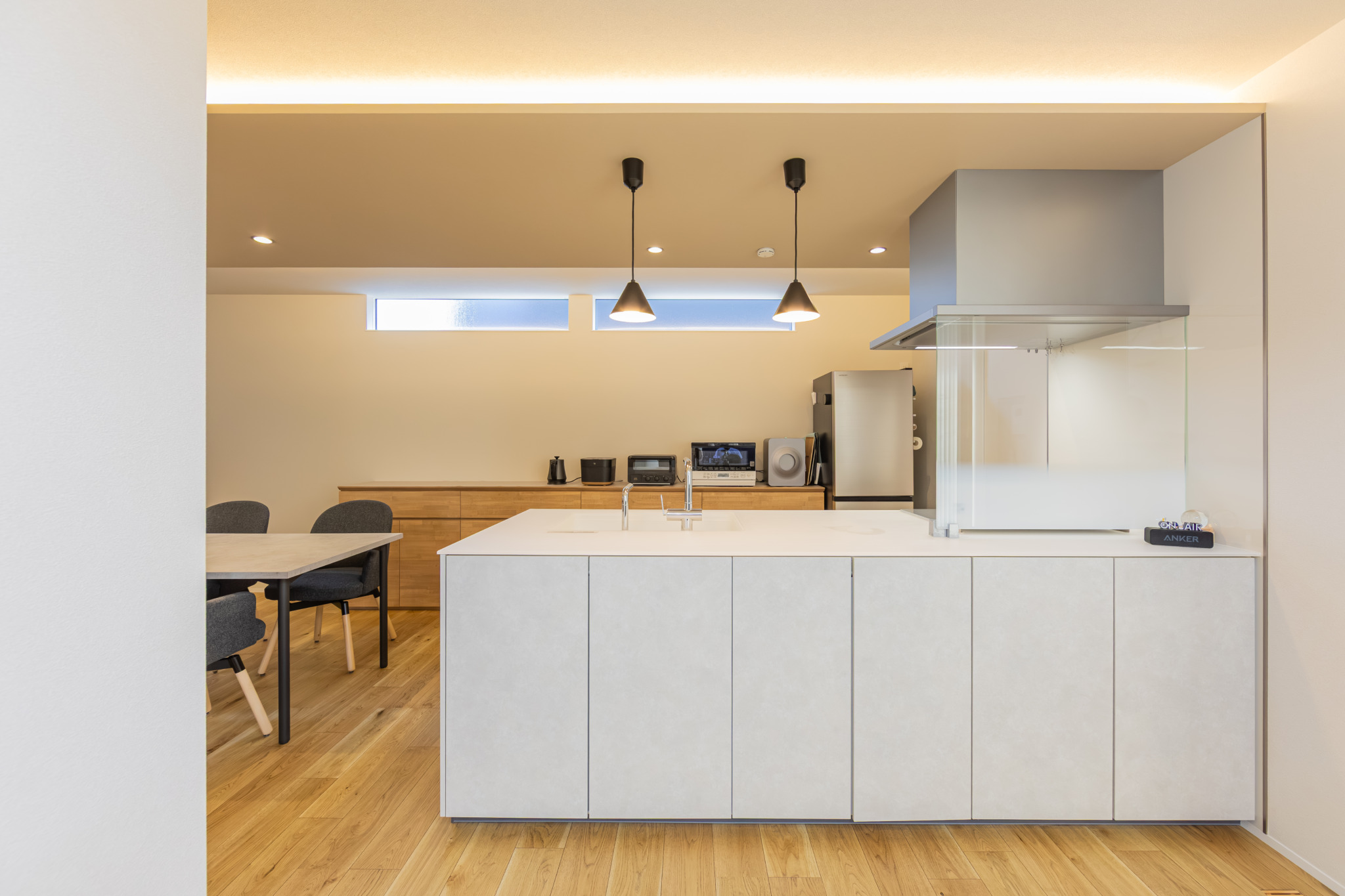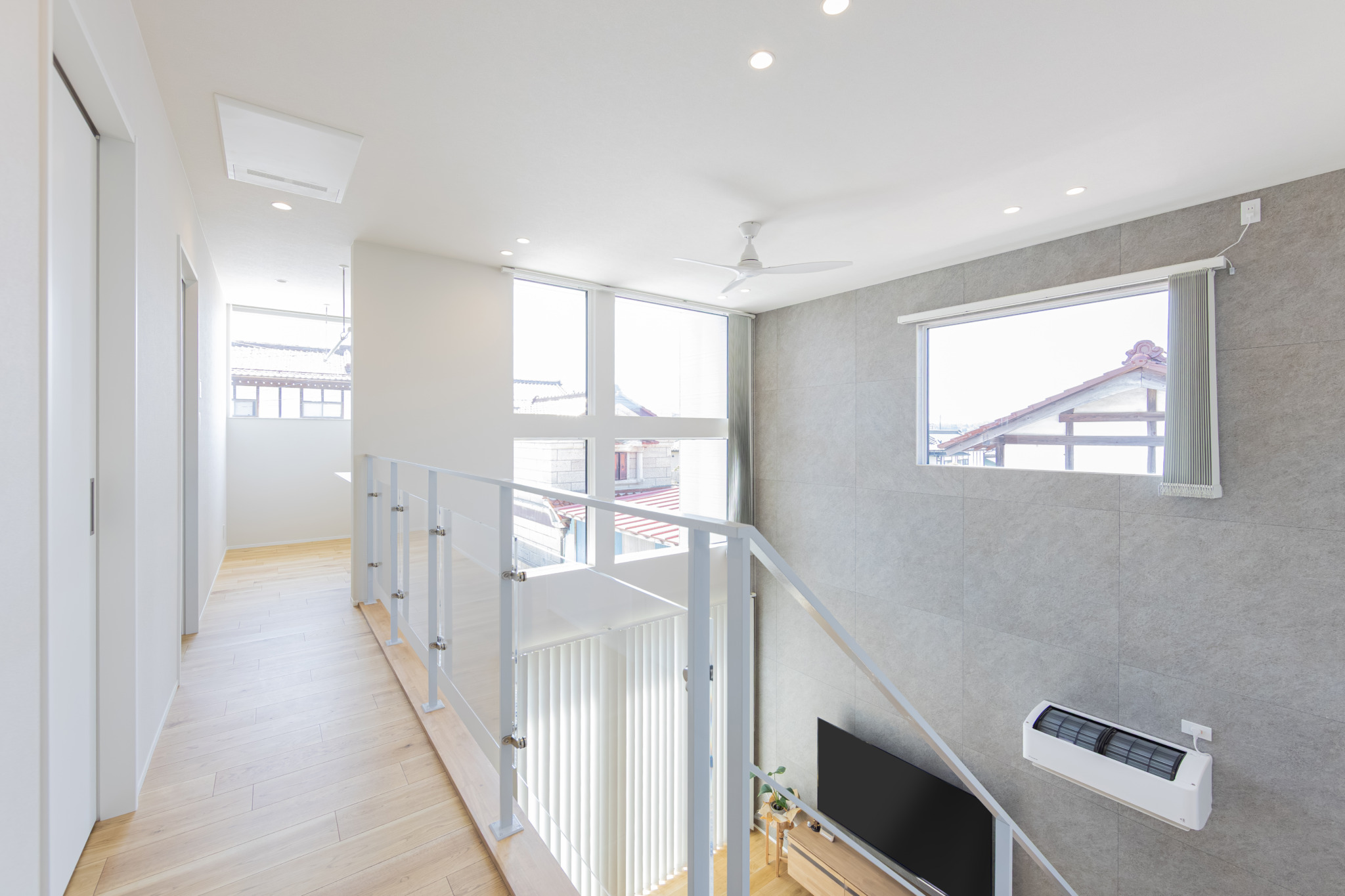 天井の高い吹き抜けは空間の広がりを与えてくれるだけでなく、自然光がたっぷりと入るので日中でも明るく快適にお過ごしいただけます。オープン階段のあるリビングは開放的で、モダンかつ洗練された印象に。