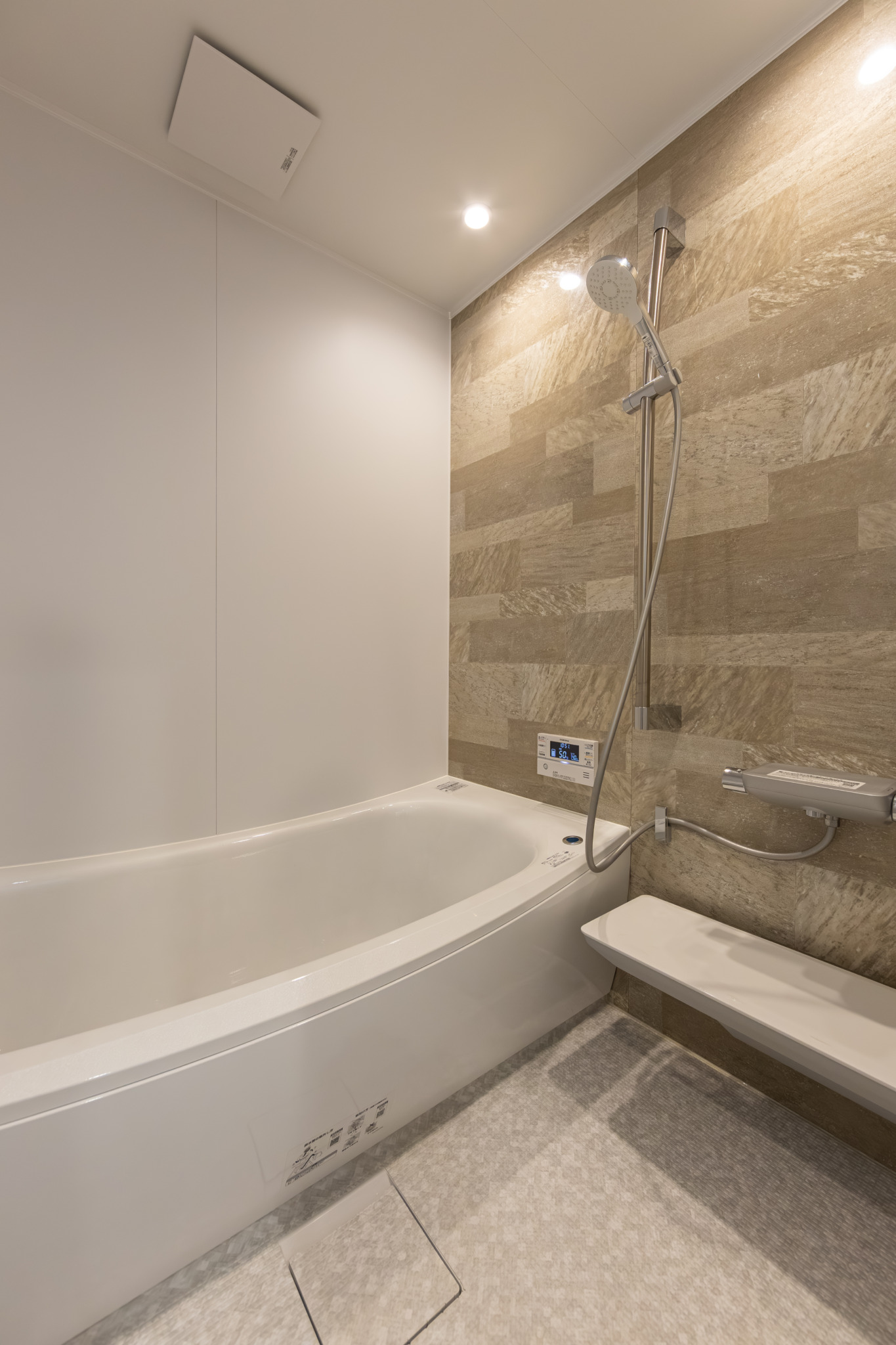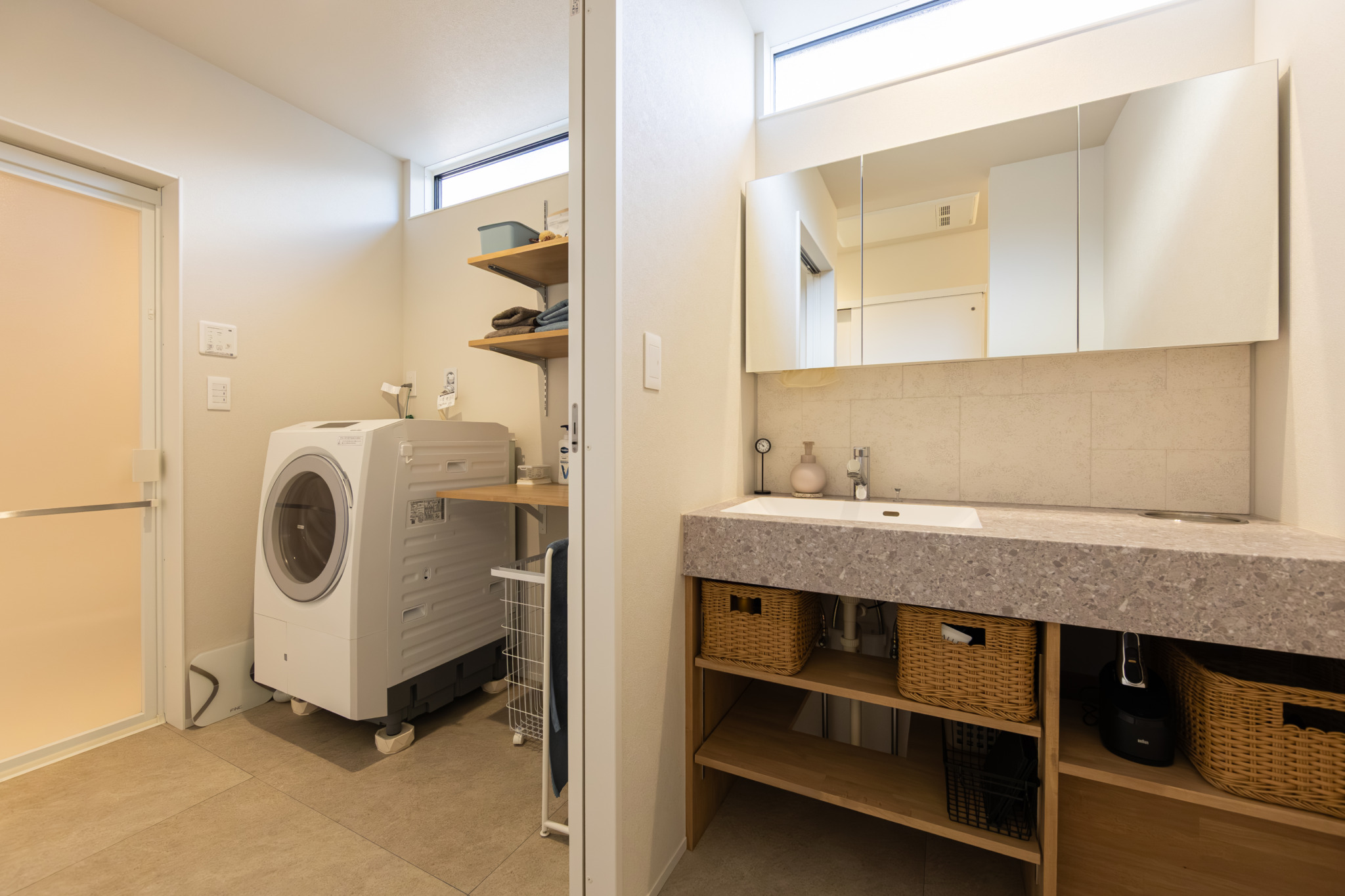 キッチンはハイクラスのペニンシュラキッチンに大容量の造作カップボードを採用し収納も炊事・家事導線もバッチリ確保。洗面はホテルのような造作洗面化粧台スマートサニタリーです。